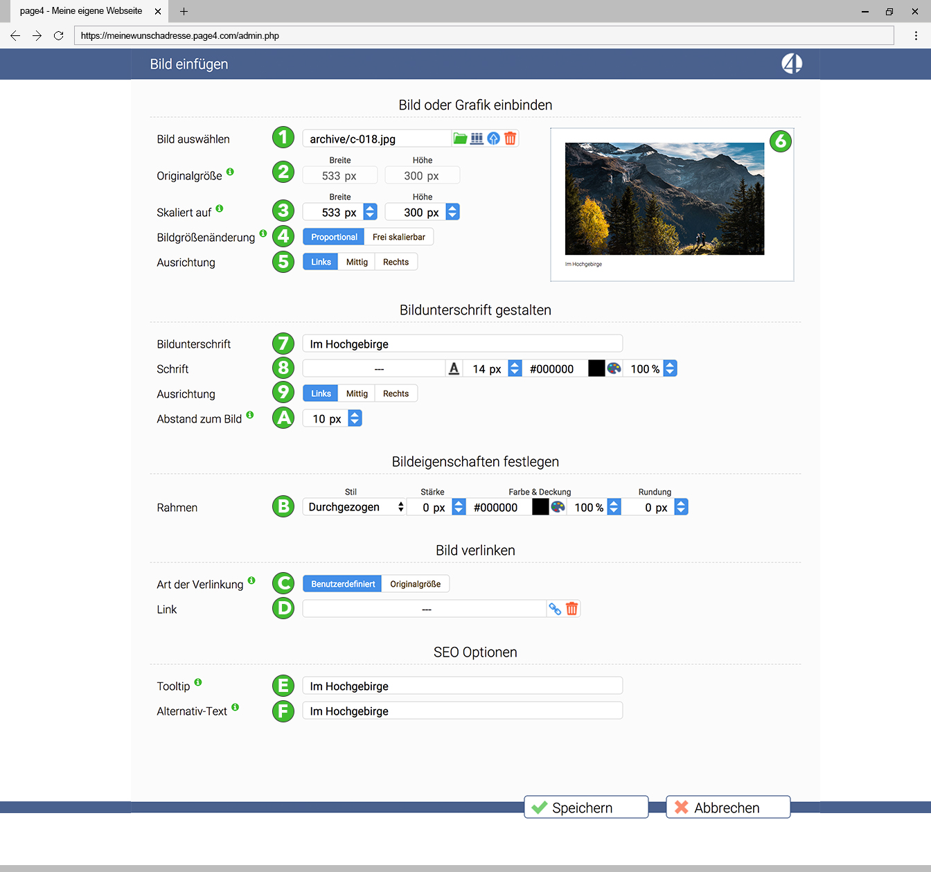 For search engines to know what kind of image it is, you should write an alternative text (E). This text will then be recognized and evaluated by Google. The tooltip (F) is displayed when a visitor moves the mouse over the image.