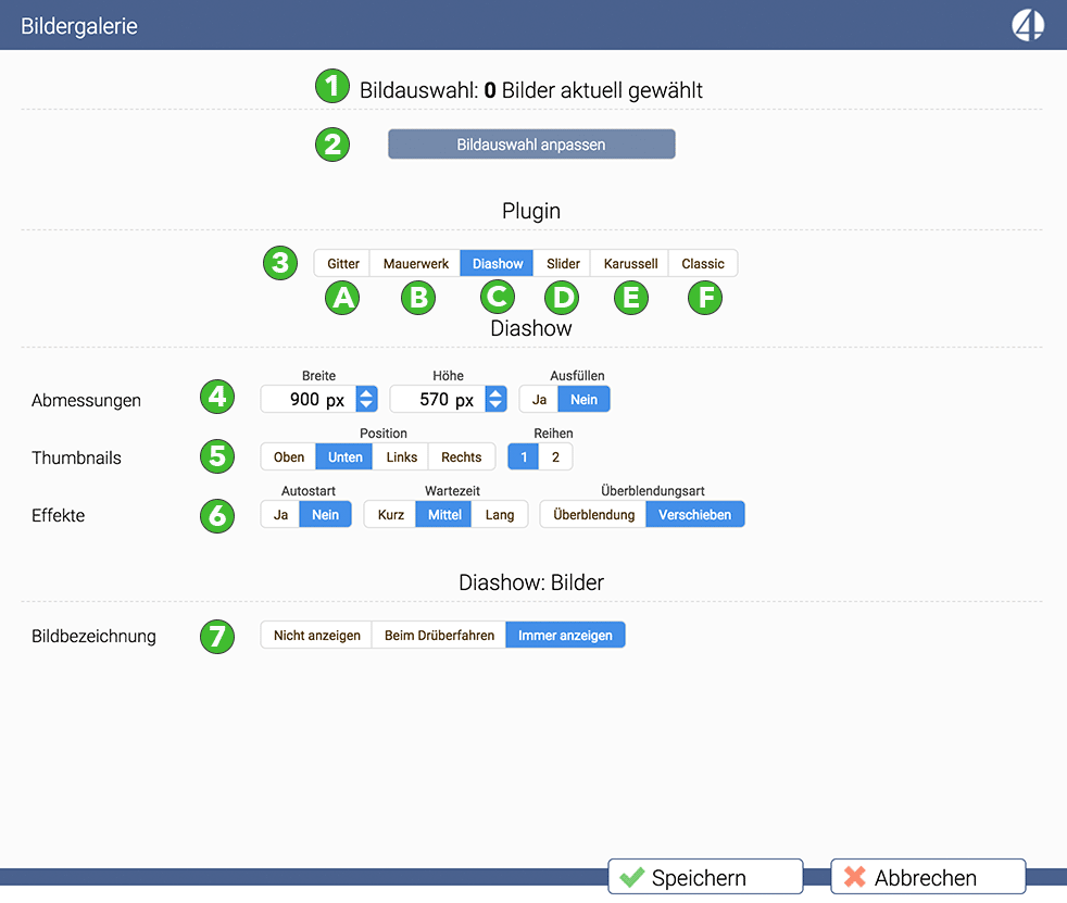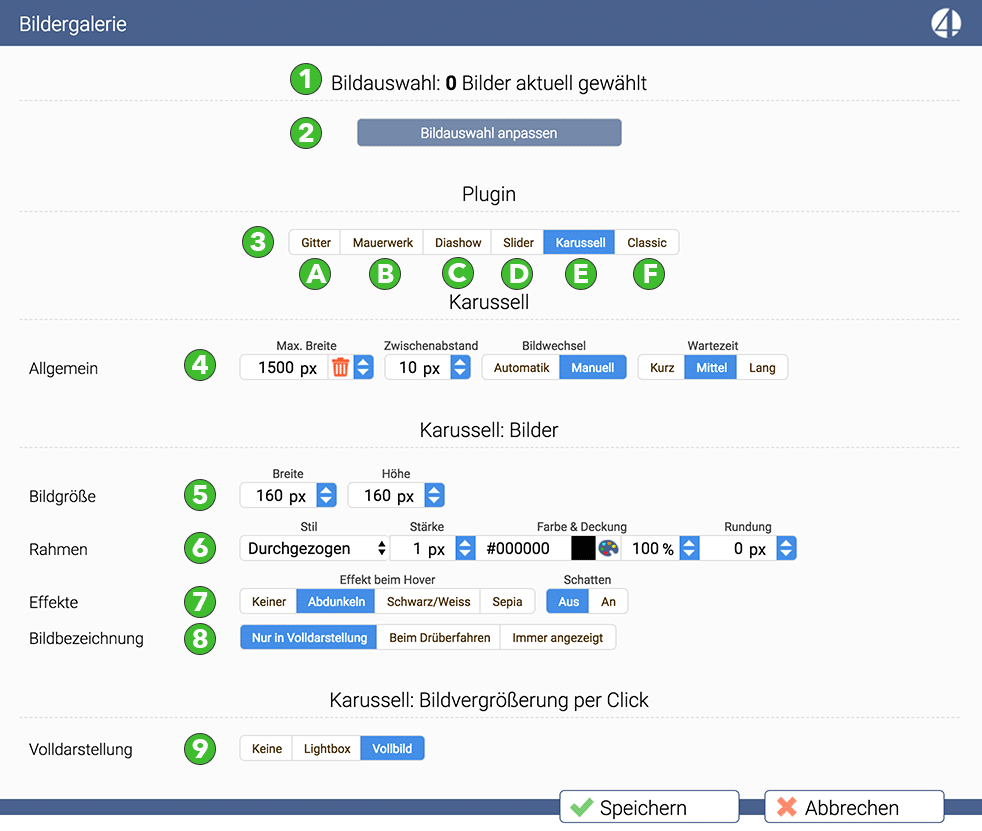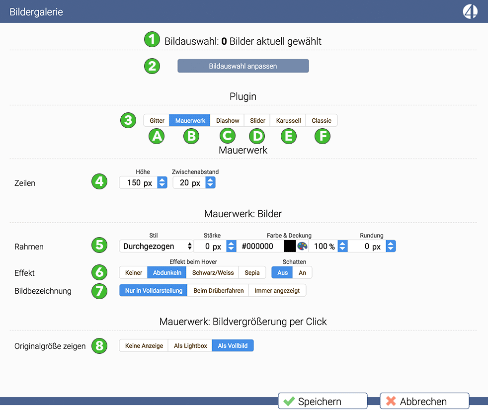 The concept is quite simple. At the top of the dialog is a hint (1) how many images the gallery contains. In our images it says 0 images everywhere, that means the gallery has no images yet and therefore can't be displayed. Below this indication there is a button (2) "Customize image selection". This will bring you to an extra dialog. There you can load images into the gallery, set the order and link or label images. These functions are identical for all galleries.