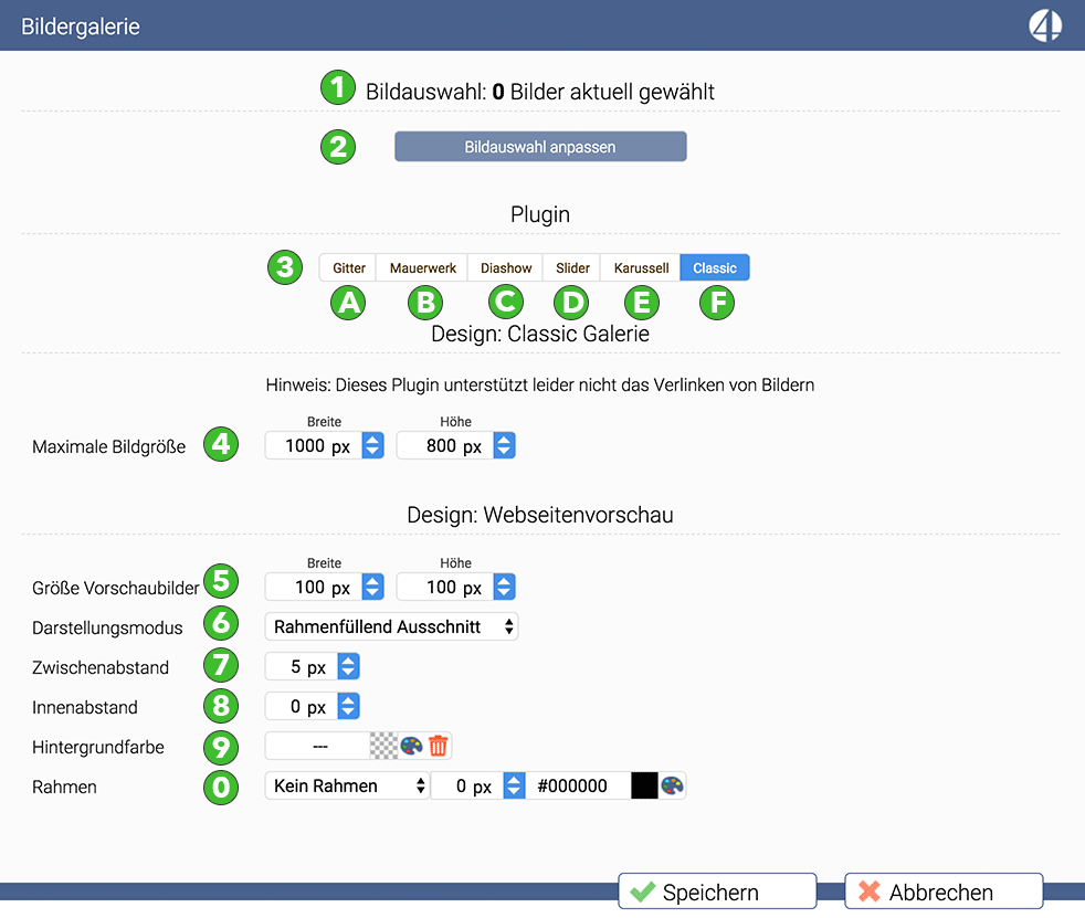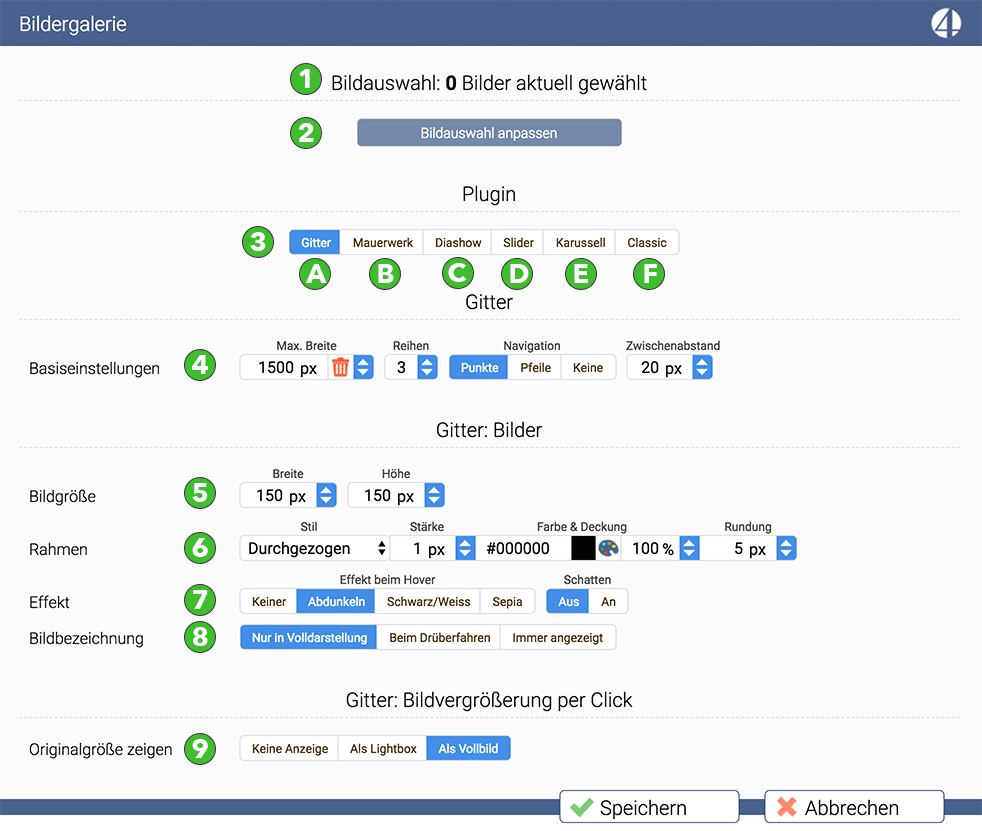 Below are the plugins (3) for the different galleries. In the first picture the gallery "Grid" (A) is selected. All settings below refer to this grid gallery. If you choose a slideshow, you have other settings. With the settings you define how the images should be displayed on your website and what should happen when you click on an image. The settings are easy to understand and if in doubt, just try what you like best.